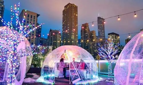 Celebre el Año Nuevo por todo lo alto con impresionantes vistas de Chicago , buena compañía, bocados gourmet y cócteles artesanales en la azotea del Hotel Godfrey. Con 10.000 metros cuadrados para la fiesta, consigue una entrada de admisión general o reserva una mesa o un iglú para tu grupo.